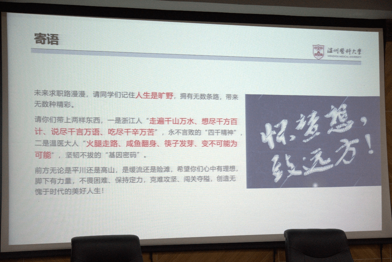 刘书记强调,毕业生年年面临“史上最难就业季”就业形势。但是,既有困境与挑战,也有政策与机遇。很多行业,如医药制造企业稳步扩容,研发、销售人才需求上涨。同时国家也会出台很多政策鼓励大学生就业创业。因此,同学们应勇于接受挑战,迎接机遇。