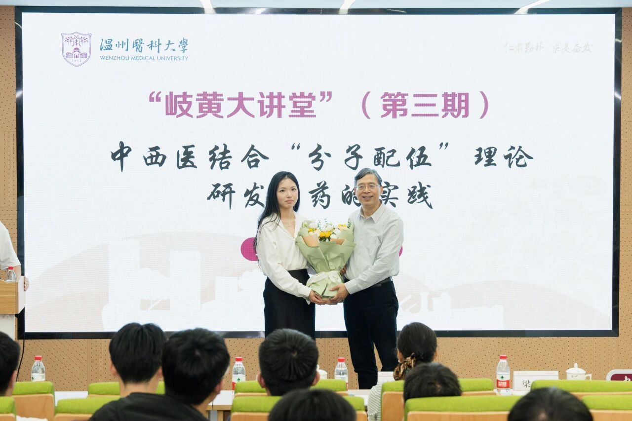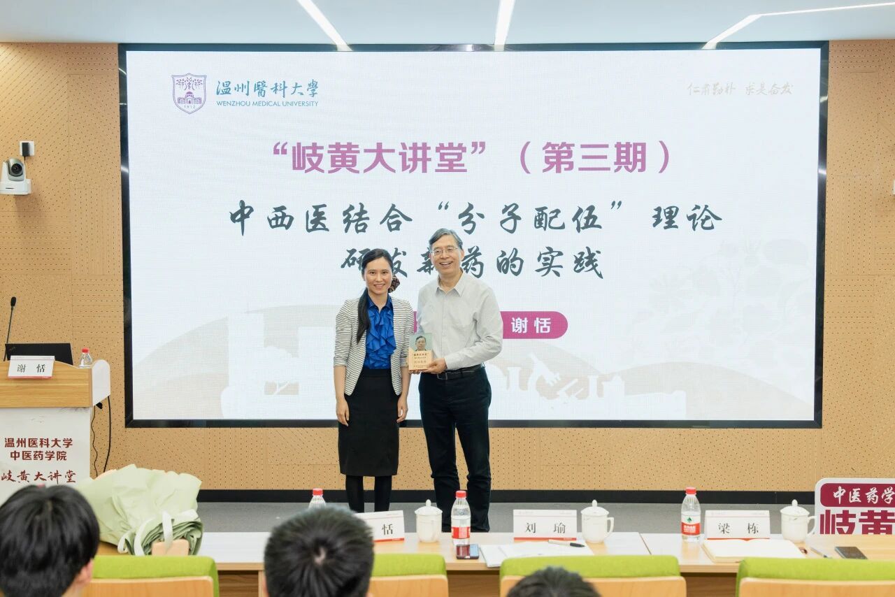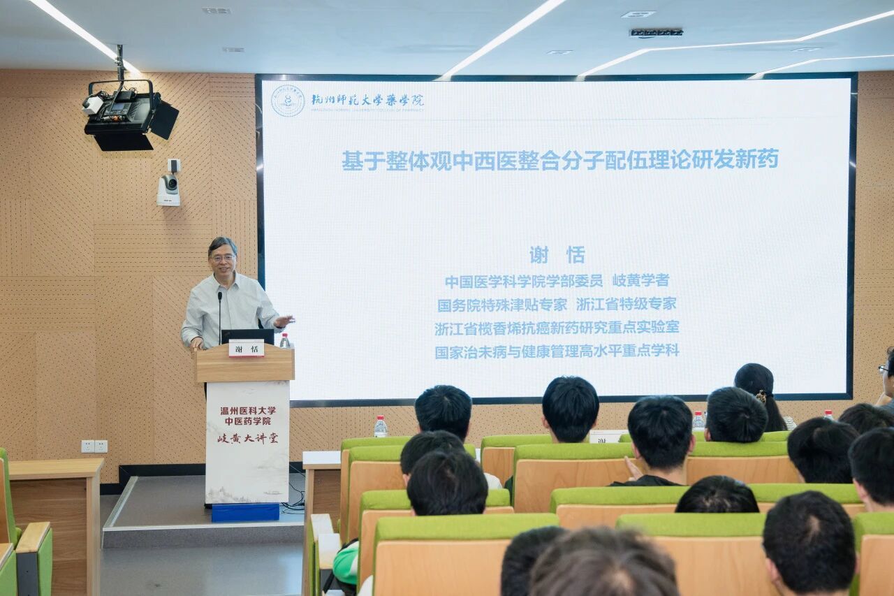 近日,国产探花 于6a107教室举办第三期“岐黄大讲堂”,特邀请中国医学科学院学部委员、国务院特殊津贴专家、国家岐黄学者、浙江省特级专家、浙江省榄香烯类抗癌药物研究重点实验室主任、国家“治未病与健康管理”重点学科带头人、国产探花 学术院长谢恬教授为国产探花 师生带来题为《中西医结合“分子配伍”理论研发新药的实践》的讲座。