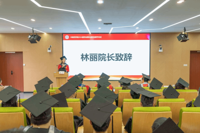 林丽院长为毕业生致辞。她首先代表学校向圆满完成学业、即将踏上崭新人生旅程的同学们致以热烈的祝贺和诚挚的祝福;向辛勤培育大家的师长们致以衷心的感谢和崇高的敬意。
