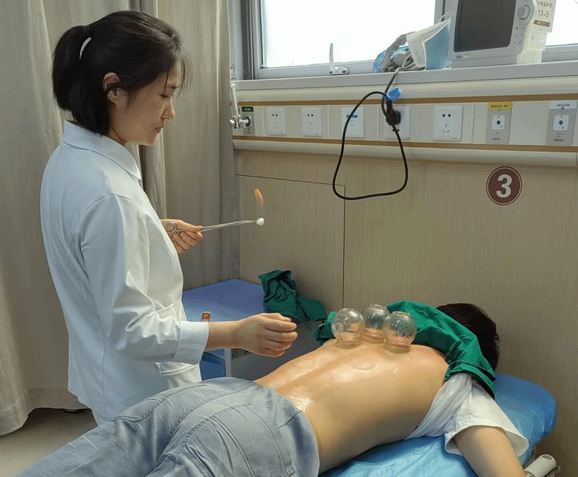最后,同学们在林陈娟老师及三位护士长的带领下,进行了三种传统疗法——艾灸、拔罐及刮痧的学习。老师们分别邀请了一位同学,在简单地介绍了各项操作的作用、注意事项及适用病症之后,边讲述操作步骤,边在体验者的身上演示具体操作,供同学们观摩学习。以刮痧为例,体验者坐在凳子上,露出后背。老师先在他的身上滴上介质——刮痧油,然后用刮痧刀均匀抹开,从后脑勺底部开始,依次是脖子后部、脖子两侧、背中间督脉等地方,这几个部位分别可以缓解头痛、脖子痛、肩痛和背部酸痛。随着演示的进行,体验者被刮过的地方逐渐泛出淤血,这是刮痧起效的标志。而当皮肤完全变红,这表示刮痧刮“透”了。演示完后,同学们纷纷在老师们的指导下,自己尝试给他人刮痧,或者体验他人给自己刮痧。在这个过程中,同学们不仅巩固掌握了一项专业技能,而且获得了真实深刻的临床体验。艾灸、拔罐、刮痧不再只是书本上一个个冰冷的名词,它们已经通过亲身体验同成员们自己的感知联接起来,他们也得以将这些技能学习的经验运用到日后的学习生活中,并帮助其他人,让中医药文化真正惠及大众。