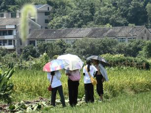 藤岙村作为浙江省温郁金GAP种植基地,拥有着数百亩优质的温郁金种植良田。跟随着当地村干部的步伐,同学们了解到温郁金是不能连续两年在同一块田种植,否则植株会非常瘦弱,这是因为去年的温郁金会留下病菌,不利于来年温郁金的生存。为此,他们采取轮耕策略,每年交替种植水稻和温郁金。