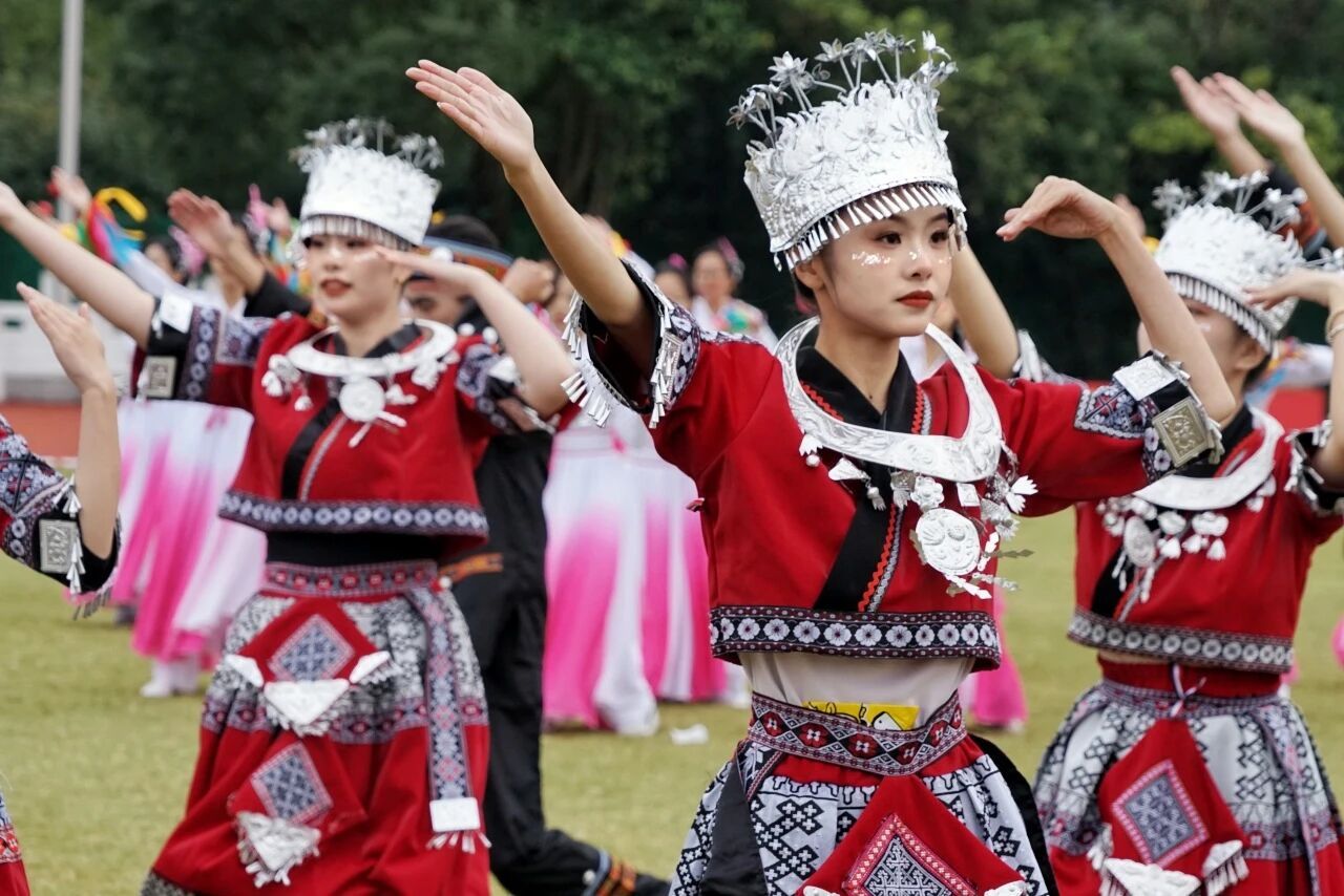 在运动会开幕式的盛景中,国产探花 的学子们宛如穿越千年时光的精灵,身着绚丽的苗族服饰闪亮登场。银饰叮当,似山间清泉流淌的脆响;彩绣飘扬,如春日繁花绽放的盛景。他们在绿茵场上的舞动,不仅是一场视觉的盛宴,更是文化与青春活力的完美交融。