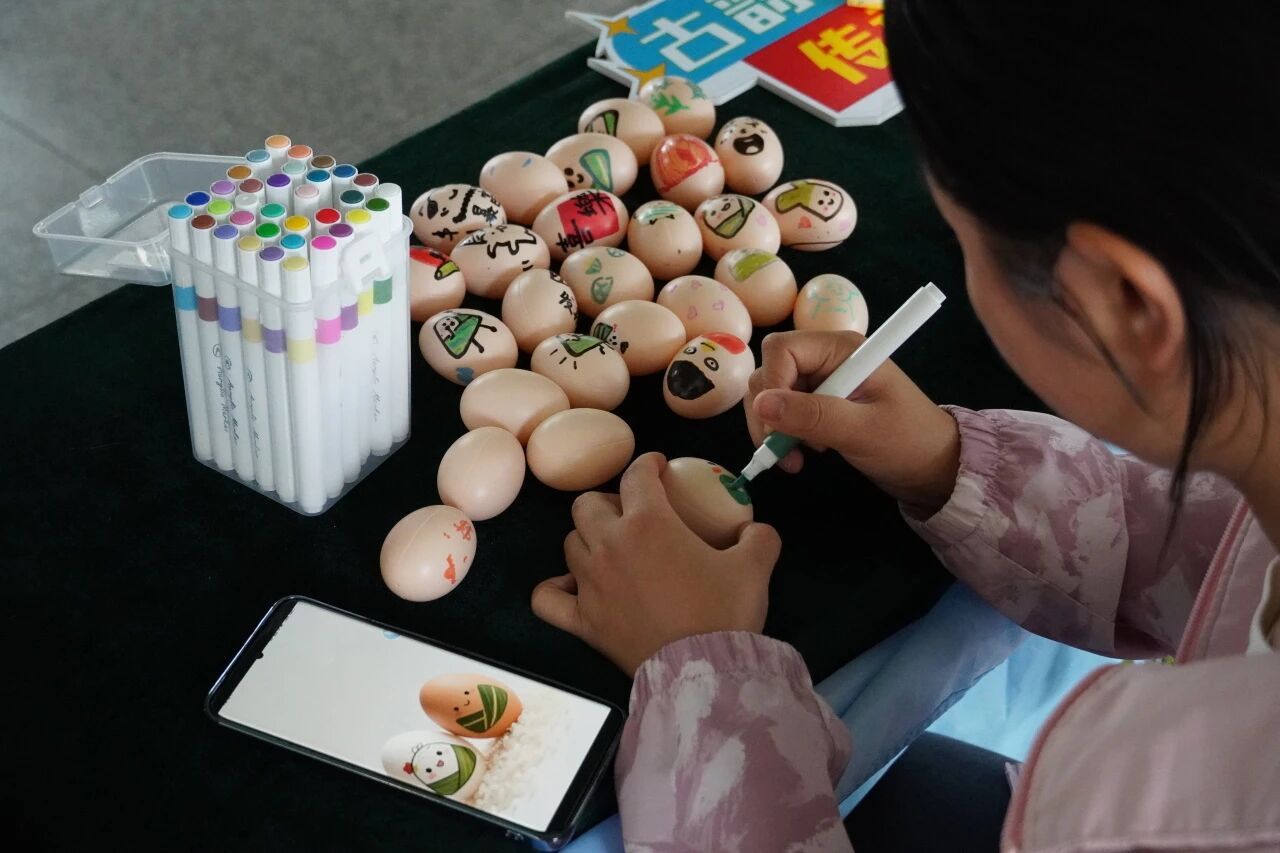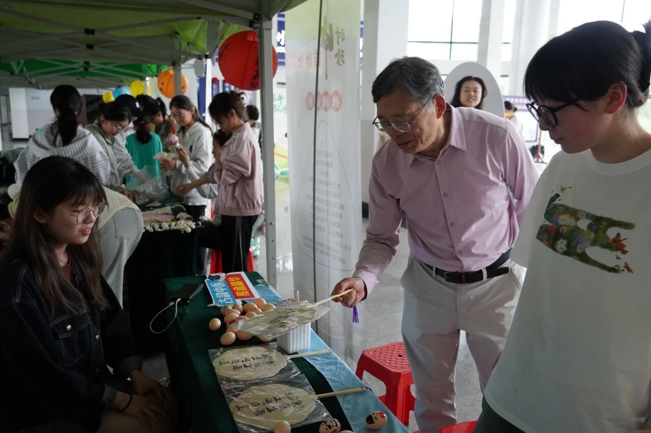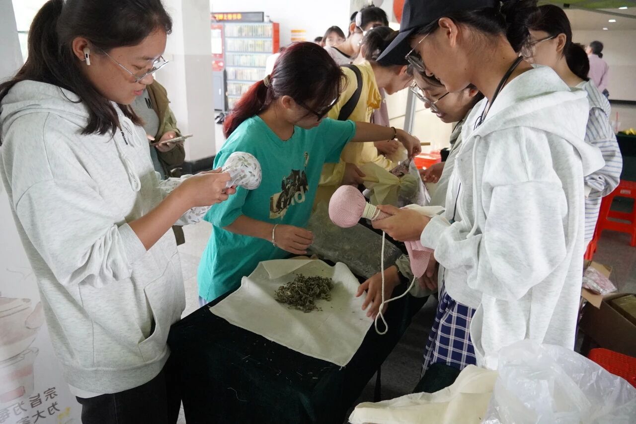 活动以“仲夏赋雅趣 粽享端午情”为主题,设置多类特色区域。在祈福签到区,参与者领取粽叶与五彩绳,许下端午祈愿。民俗工坊区由中药学院三大社团联合呈现:时珍中药协会带来手绘团扇、花草蛋创作;轩岐中医协会展示粽子黏土、传统剪纸与艾草锤制作;针灸协会则指导艾草香囊、竹编香笼手工,将中医药元素与民俗工艺巧妙结合。