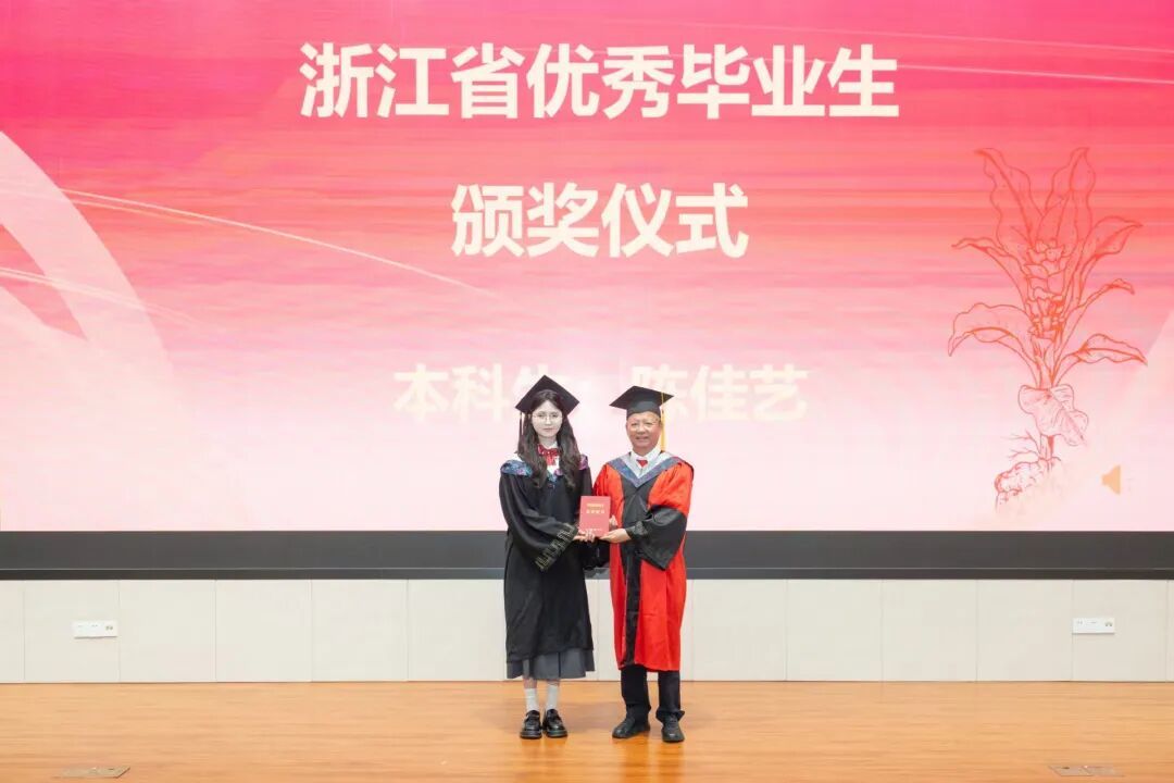 程锦国、谢恬为获得2025年浙江省优秀毕业生的陈佳艺、张元龙颁发荣誉证书,刘瑜为获得2025年学校优秀毕业生的顾丹霞、洪颖、陶然、周广雯、张晨晰、麻黄听,金胜洁7位同学依次颁发荣誉证书。