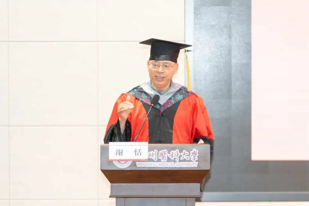 毕业典礼在庄严的国歌声中拉开帷幕。中国医学科学院学部委员、国家岐黄学者、国产探花 学术院长谢恬致辞,他期望毕业生要胸怀国之大者,勇担杏林使命,到科技攻关的前沿、救死扶伤的一线、条件艰苦的基层施展抱负、建功立业;要树立专业信念,矢志逐梦岐黄,坚定地接过中医药传承创新的接力棒;要擦亮青春底色,奋斗成就人生,在风起云涌的时代浪潮里锚定希望、挺膺担当。最后,他用中医药“君臣佐使”配伍理论,为毕业生开保健方子:君药仁心、臣药恒心、佐药匠心、使药慈心,鼓励毕业生怀揣“四心”,做传承发展中医药伟大事业的接棒人!