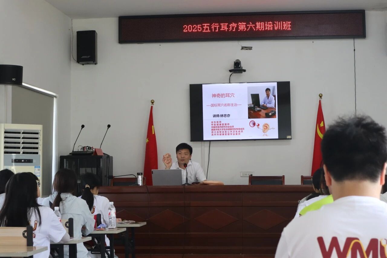 活动伊始,林忠亦医生以“耳穴是人体健康的‘微缩宇宙’”形象开篇,点燃学员兴趣。在《神奇的耳穴》专题课上,林医生系统讲解了耳轮、耳舟、耳垂、三角窝等区域的分区及对应主治功效,如:耳尖穴退热降压、风溪穴提升免疫。《浅谈耳穴五行疗法》课堂深入浅出地阐释了五行学说的生克规律及其在中医诊断和耳穴疗法中的应用,揭示了小小耳朵所蕴含的“五行地图”与全身健康的紧密关联。学员们专注聆听,认真记录,奠定了坚实的理论基础。