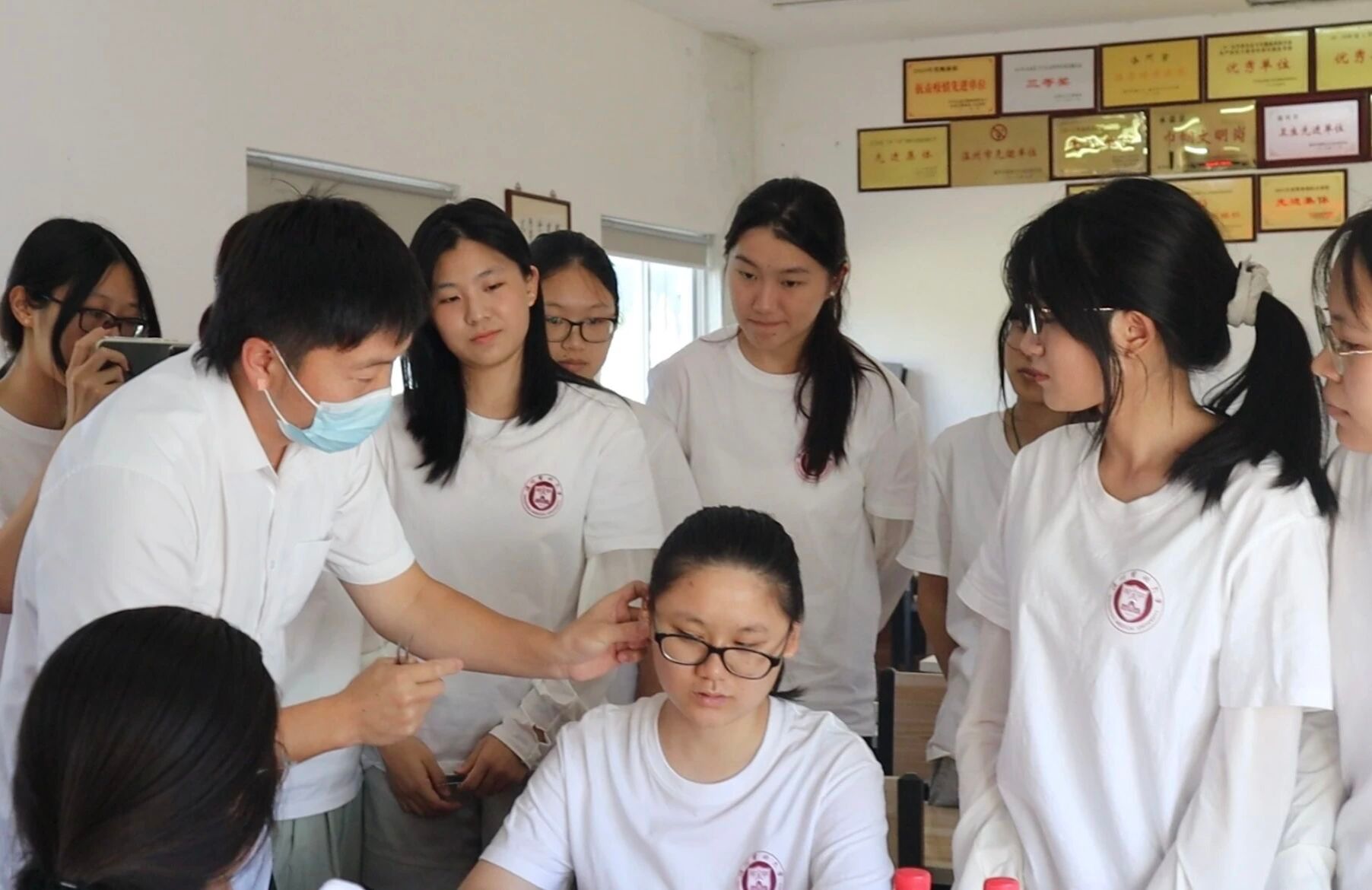 从理论认知到亲身体验是本次活动的重要环节。林医生及其团队进行了专业的现场耳穴诊疗示范,精准展示穴位定位与按压手法。随后,在林医生的指导下,学员们亲自体验诊疗过程。当指尖触及那些蕴藏生命密码的穴位,同学们不仅感受到身体的即时反馈(如酸胀感),更体验到一种跨越时空与千年中医智慧相连的独特共鸣,实现了从“知”到“行”的跃升。