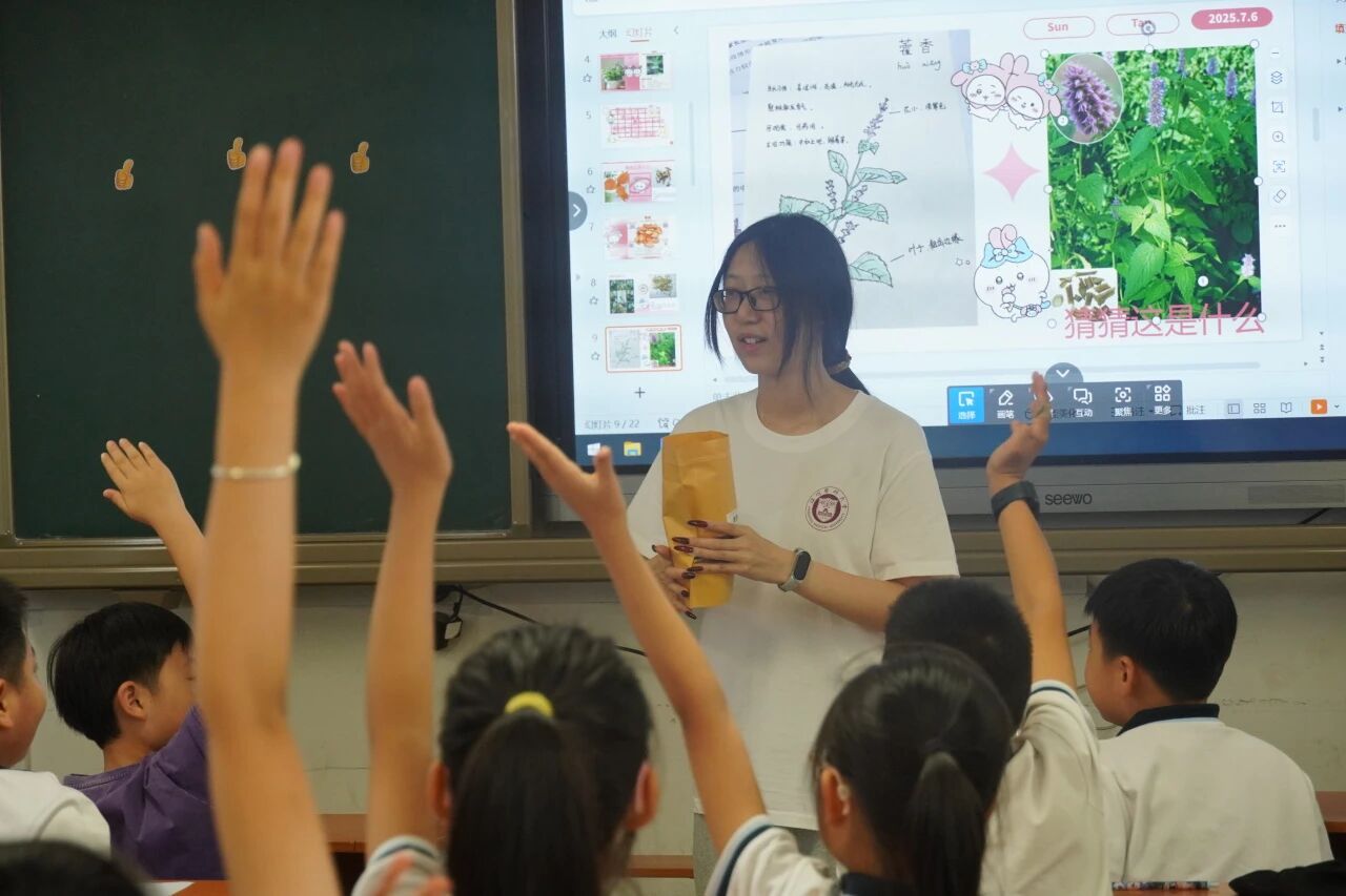 《常见中草药鉴别与绘画》课堂上,实践团成员刘烨化身“百草小导师”。她向孩子们展示了薄荷、紫苏、鱼腥草等十余种温州道地中草药的高清图片。课堂瞬间被点燃,孩子们纷纷举手抢答,气氛热烈。刘烨不仅细致讲解了植物的根、茎、叶、花特征,更引导孩子们亲手触摸、嗅闻真实的草药标本。“薄荷叶子凉凉的,有香味!”“艾草背面有小绒毛,软软的!”通过视觉、触觉、嗅觉的多重体验,抽象的草药知识变得鲜活立体。绘画环节,孩子们用画笔描绘自己最喜爱的草药,翠绿的鱼腥草、红艳的枸杞跃然纸上,加深了认知与情感联结。