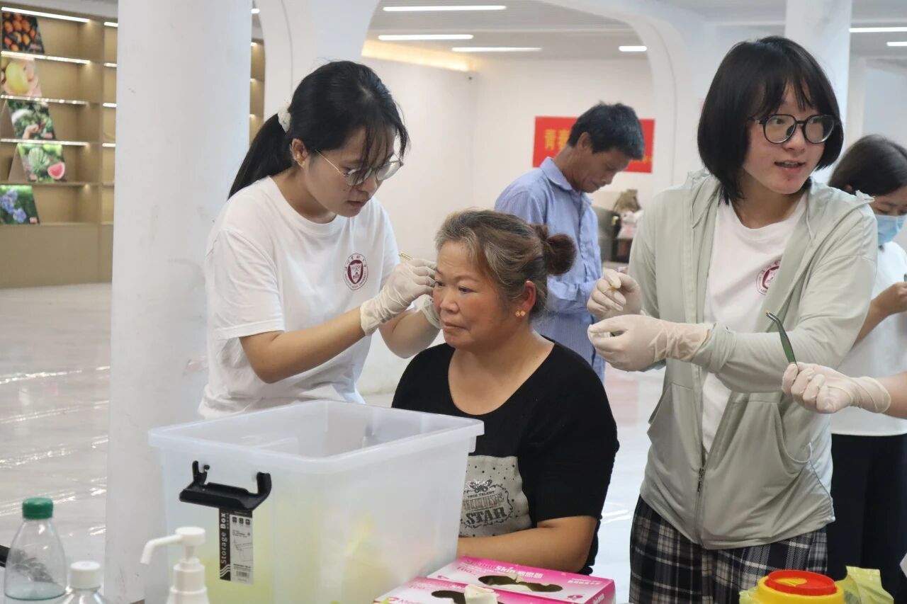 在枫林镇垟山头村文化礼堂,林丽一行实地观摩实践团开展的耳穴埋豆义诊活动。成员们熟练运用专业技能,为村民讲解耳穴原理、精准贴敷王不留行籽,并示范按压技巧。林丽高度肯定同学们将中医药技术带进基层的实践,强调耳穴疗法适宜乡村推广,既能服务村民健康,也为学生提供宝贵锻炼平台。